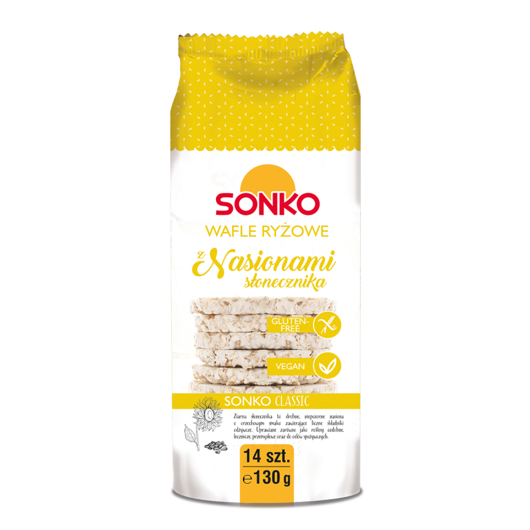 Sonko Rice сakes with sunflower are baked with natural brown rice, blended with refined sunflower seeds and salt, no sugar added. They contain complex carbohydrates, which are the most important source of energy and essential in human nutrition. Do not contain gluten.